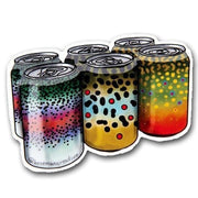 Original illustration of delicious 6-pack of beer or soda, your choice, but we all need to hydrate while we fish... 2 cans of each: brown trout, rainbow trout and brook trout.