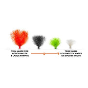 Presentation is perhaps the most important part of catching fish. When fishing nymphs beneath an indicator in front of spooky trout, having the perfect indicator could be the difference between landing a giant and going home disappointed. This is the best indicator we've found. Easy to attach and remove, this kit includes an applicator tool, a sampling of white and chartreuse wool, and 12 inches of size small replacement tubing. It's subtle as it lands on the water, sensitive when fish touch the fly, and won't get bogged down with water. Combo pack now includes four colors of yarn (black, white, orange, chartreuse.) Size large tubing is used to make larger indicators, size small is used to make smaller indicators.