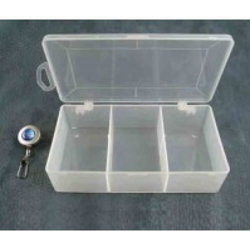 Fly box - 3 Compartments Size: 7 '' L x 3''1/2 W x 1''1/2 H Perfect box for storing large dry flies for trout, salmon bombers and bass poppers.