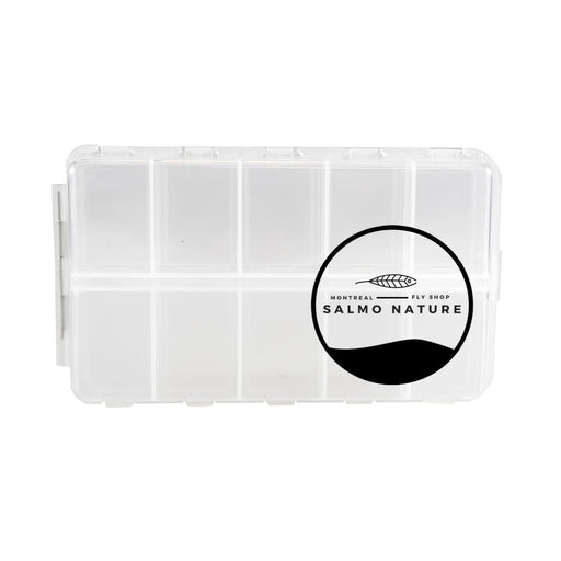 Fly box - 12 Compartments Size : 6'' L x 3''1/2 W x 1'' H Perfect box for storing small dry trout flies, nymphs, egg patterns and emergers.