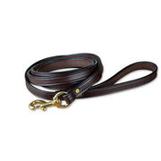 A distinctive dog leash with an actual brass shotgun hull crafted in genuine, finely tanned leather.