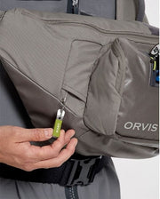 The best-selling Orvis fly-fishing Sling Pack has been updated and improved not only for durability, but with innovative new convenience features as well. The 100% recycled CORDURA® ECO; platform is designed to store, organize, and offer easy, intuitive accessibility while staying completely out of your way when fishing. New features include the Tippet Whippet recessed docking station with tippet bar included for instant, fixed, and fumble-free access for up to six spools. Main compartment has zippered security pocket with key fob and stretch mesh pockets for small sort storage. Front drop-down has zippered pocket with elastic mesh slip pockets. Lo-pro zinger/nipper pass-through, easy swing handle, and water bottle holder with retainer. Front strap “dashboard” offers multiple docking stations for forceps and small tools as well as sliding adjustment for sternum strap. Left shoulder design frees up casting arm and shoulder.